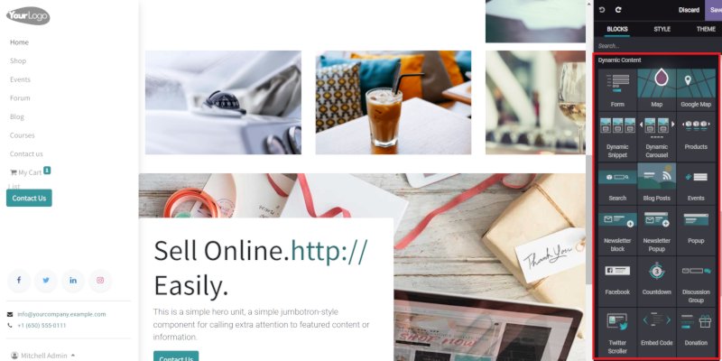 Con Odoo puedes crear una página web profesional sin necesidad de saber programar. El constructor visual te permite añadir textos, imágenes, formularios de contacto, mapas, blogs y galerías con solo arrastrar y soltar.